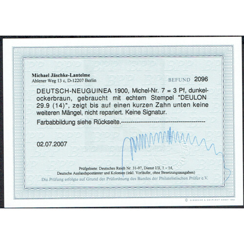 New Guinea: 1900 3pf yellow-brown Yacht with good cancel of DEULON DEUTSCHE NEU GUINEA 29.9 / 14 cds cancel, rare! Complete with 2007 Jaschke - Lantelme certificate.