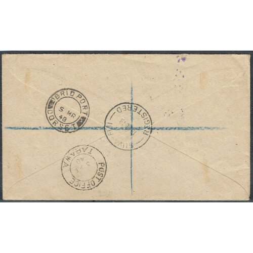 1948 (3 Feb) Registered cover to UK bearing GVI 5s defin tied POST OFFICE / TARAWA cds to UK and regd h/s No. 204. Suva and arrival b/s.
