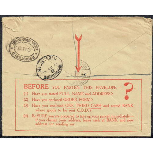 1937 (29 Jul) Printed Wright & Co UK envelope sent registered bearing 1d brown GV strip of 4 tied DODOWAH cds cancels, regd etiquette alongside, backstamps incl ACCRA, Birmingham transit, printed payment instruction in red on reverse. Wrinkles and creases.