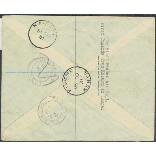 1931 (26 Oct) First Flight Kisumu - Nairobi regd airmail cover Feeder Service to the Imperial (Africa) Airways, bearing 30c & 50c tied KISUMU cds with typed flight plan from each town and city addr to Tanga in Tanganyika.