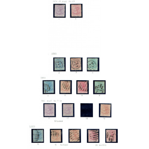 1874-1893 Mint and used collection with better throughout identified on leaves including 1874 1d & 4d mint (Cat £230), 2d to 1s used (Cat £199), 1876 1d mint, used 2d to 1s used (Cat £200+), 1882 1d mint (2, cat £110), 2d blue unused (Cat £200), 3d mint, 1884-6 six values to 1s mint plus shades (Cat £330), used to 6d, 1887-1902 set of 12 mint (Cat £225), 1893 surcharges mint plus two ovpt varieties, useful assembly, good cat value. (59).