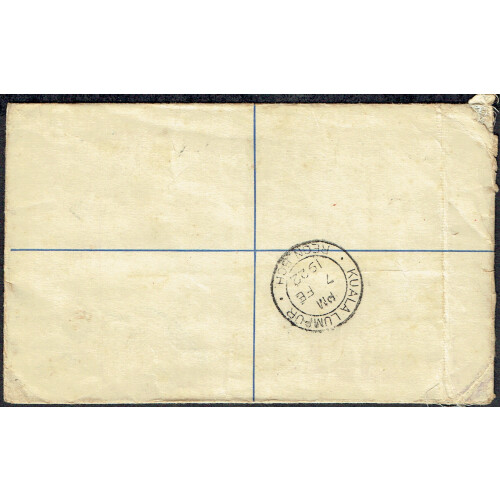 F.M.S.: 1922 10c blue registered postal stationery envelope (roughly opened incl soil marks) uprated with Tiger 1c brown pair, 2c & 4c tied SUNGEI BESI cds tied cds cancels addr to UK. Various faults, Sungei Besi regd etiquette 406.