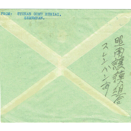 Japanese Occupation of Perak: 1942 (12.9.2602) Airmail envelope to Negri Sembilan with typed address bearing DAI NIPPON / YUBIN / 2 CENTS surcharge on Perak 5c brown (2) plus Japan 3s green both tied in combination with SEREMBAN CDS's, Japanese violet CDS on obverse (2602 / 12 / 8-14). SG J261.