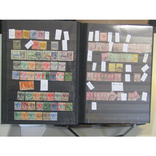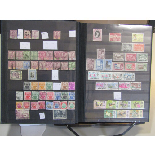 Large 64 sided stockbook well filled with QV to modern mint and used including Straits Sett., QV to 96c, surcharges mint and used, GV to $5 m & u, Johore to $5, Kedah to $1 plus Borneo ovpts 21c & 25c mint, 1937 Sultan to $1, Kelantan, Pahang to $5, Penang to $5, Perlis, Selangor, Sarawak, etc, 100s.