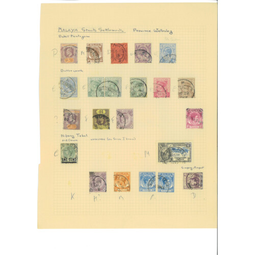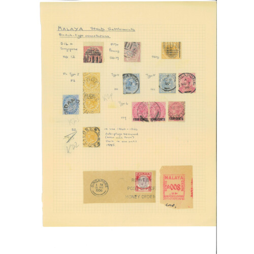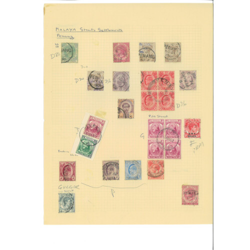POSTMARKS COLLECTION - QV onwards extensive range on leaves arranged by types, including Straits Settlements duplex cancels D14, D17, different cds types, incl dotted SINGAPORE, d/r, slogan cancel, date slugs removed, Penang cds's incl on Siam, Perak squared circles, Butterworth arc types, Nibong, FMS Tigers used in different areas, Pahang, Kedah, FPO's in Malaya, India type cancels B172 (5), Dumb or dotted cancels, 1924 MALACCA BRITISH EMPIRE EXHIBITION ovals, Shipping cancels, then 1940s-60s states cds cancels, dozens on leaves, interesting lot. (Approx 550+, not including very modern postmarks).