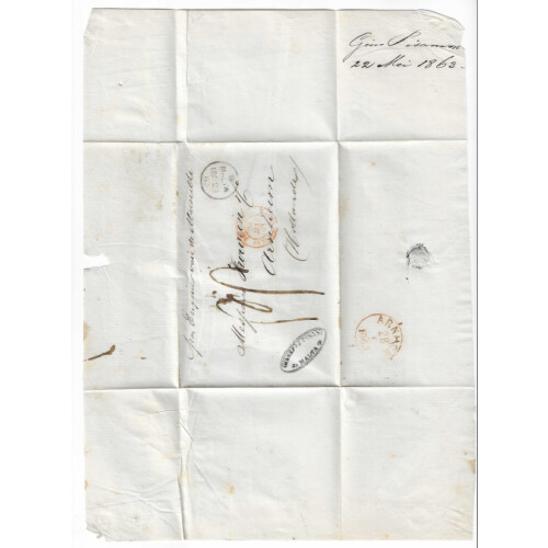 1863 (22 May) Entire to Holland sent via Marseilles cancelled with neat single CDS CODE B / MALTA / MY 22 / 63 on obverse alongside French AMB CDS in red, charge marks 3 (Decimes) in manuscript and nice GIUSEPPE PISANI MALTA oval cachet, Arnheim arrival backstamp.