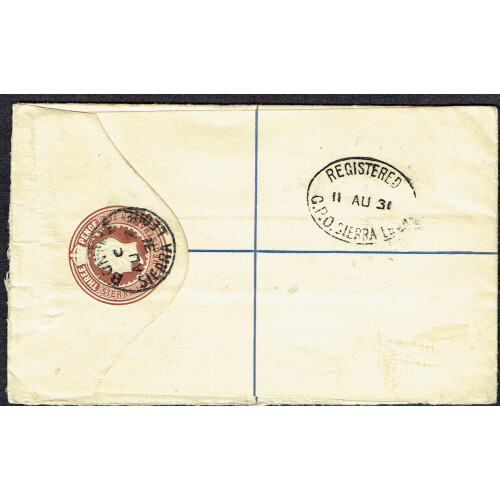 1931 (7 Aug) 3d brown registered postal stationery envelope to UK uprated on the front with 2d grey tied BONTHE cds cancels.