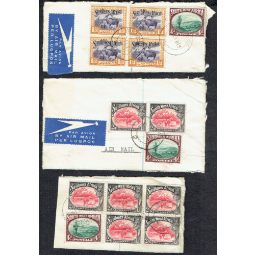 1931 Commercial frankings on several pieces incl 2/6 pair (3), 1/3 block of 4. SG 81/82.