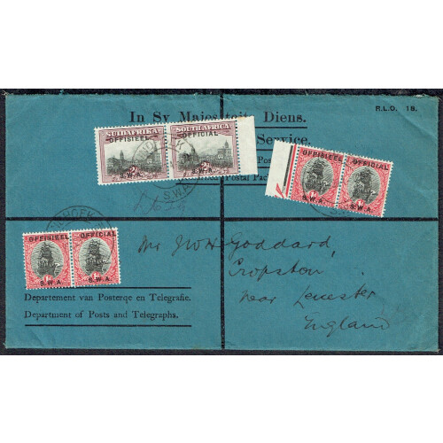 Officials: 1929 (July) Dark blue printed OHMS registered cover Windhoek to UK bearing 2d pair (right marginal) showing no stop after official variety and two 1d pairs each tied d/r WINDHOEK cds cancels. A little roughly opening and hinge marks on reverse but striking official use rate x 15 on cover. SG O6/7a. Huge cat value.