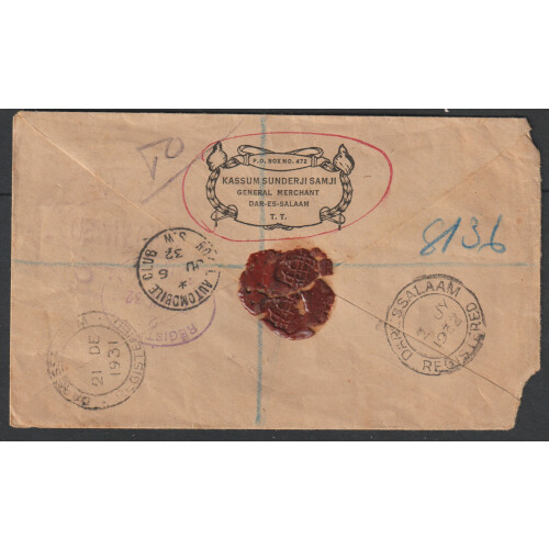 1931 (21 Dec) Registered manilla envelope to the Royal Automobile Club London bearing 15c black and red GV Heads x 4 singles tied DARESSALAAM REGISTERED cds cancels, with torn regd etiquette, with large two line RETURN TO SENDER / Unclaimed violet h/s, and R.A.C UNCLAIMED oval cancel in violet front and back. Additional ROYAL AUTOMOBILE CLUB Ju 6 32 cds on reverse and sent back to General Merchants address on reverse. Faults incl torn corner but interesting and unusual cover.