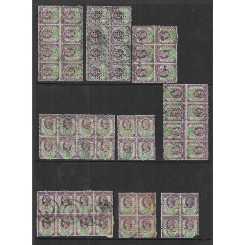 1887 1½d dull purple and green a small group of perfinned blocks of 8 (9), blocks of 6 (4), blocks of 4 (3), mixed condition mostly on original paper with a variety of cancels, perfins are fancy AI s. (108 stamps). Cat £1900+.