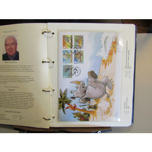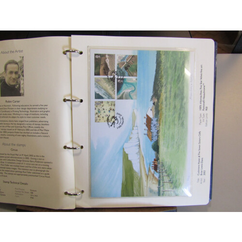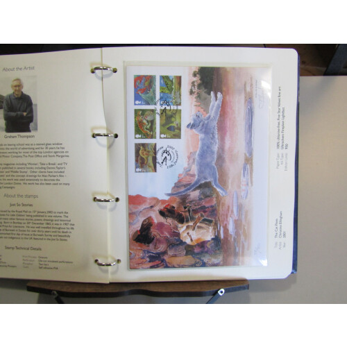 2002 Artist's Cover Collection published in limited editions by Royal Mail produced to museum standard fine art quality each signed in pencil and numbered by the original artist noted Golden Jubilee (2, Michael Noakes), Rudyard Kipling Just So Stories (2 diff, Christine Ellingham, Graham Thompson), Coastlines (Brain Davis), Circus (Robin Carter). Full biography on reverse about each artist. (6). Huge current retail £95 each!