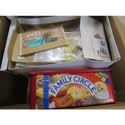 Thousands on and off paper in two boxes stashed in tubs, and shoeboxes, mainly modern worldwide, huge amount to sort.