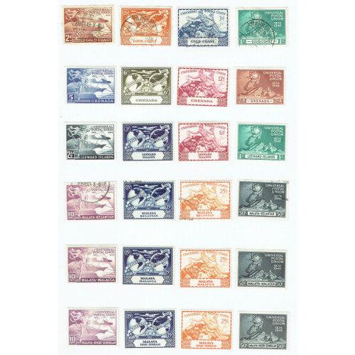 1949 UPU 18 mint sets on leaves incl Cyprus, Malayan states, New Hebrides, Zanzibar etc. 72 stamps.
