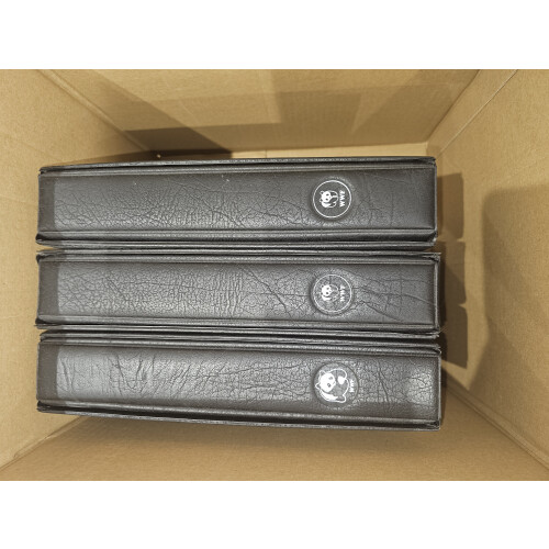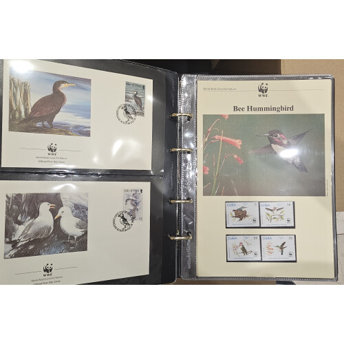 World Wildlife Fund: Three colourful collection in black binders and slipcase with dozens of different animals written up stamps and covers. Attractive lot.