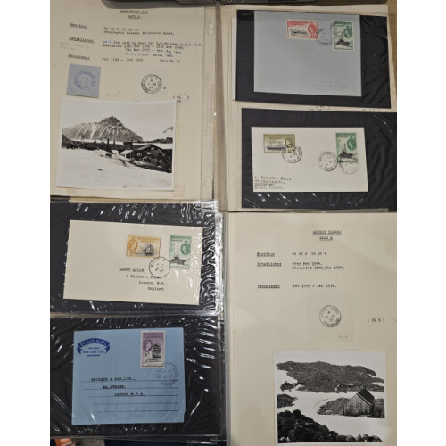 ISLAND BASES: 1950s-1970s Good collection of covers written up on leaves some with photos or pictures of the bases, the dates in use and handstamps used plus dates evacuated, noted ADMIRALTY BAY BASE G (5), DANCO ISLAND / BSE O (4), ANVERS ISLAND BASE N (3), PROSPECT POINT BASE J (2), MARGUERITE BAY BASE E incl STONINGTON ISLAND (5), HOPE BAY (8), PORT LOCKROY BASE A (5), HORSESHOE ISLAND BASE Y (4), LOUBET COAST BASE W (4), intr lot. (c40).