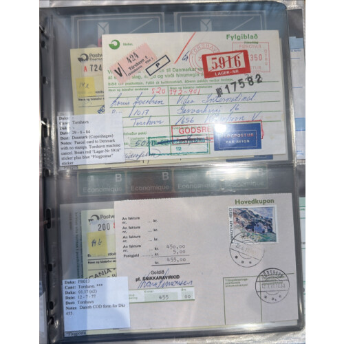 1934-1957 THORSHAVN covers used with Denmark adhs tied cds cancels, incl a 1957 correspondence some sent locally incl Kvivik, Eidi, Vagur, for 12 covers, a couple incoming, Mailbag labels unused for registered post Klaksvik, Vagur, Tvoroyri, Ordinary Mail unused printed tags (9 for different areas), Cash on Delivery forms used in Thorshavn, Parcel cards incl airmail (14), various postal ephemera labels, Giro forms / postal orders (14). Intr lot.