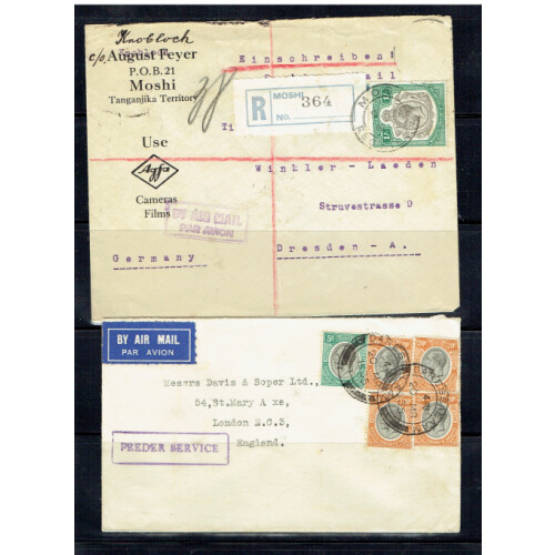 1932-35 Five covers from the GV period including 1932 Regd cvr Moshi to Germany bearing 1s GV keyplate and smaller stamp missing with Use Agfa Cameras Films advert, 1932-35 two FEEDER SERVICE covers to London or Nairobi addr to Wilson Airways, 1932 regd etiquette TANGANYIKA TERRITORY from MOSHI, 1932 Illustrated Springbok IMPERIAL AIRWAYS 1st flight to England and South Africa written up on album page. Nice group. (5).