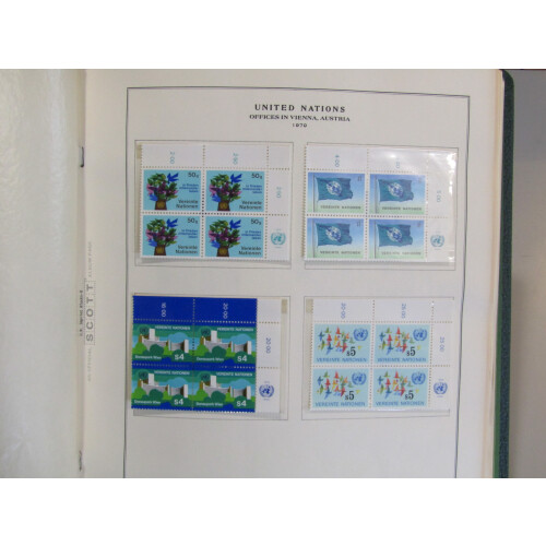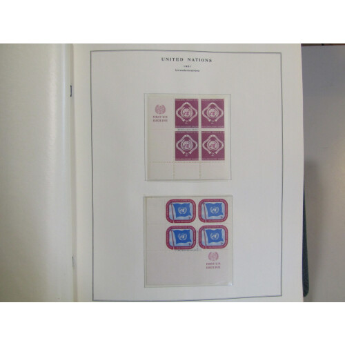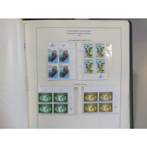 1951-1984 Unmounted mint collection in two hingeless printed Scott albums with high degree of completion each set in plate block of four, includes USA, Geneva, Austria issues. Attractive lot.