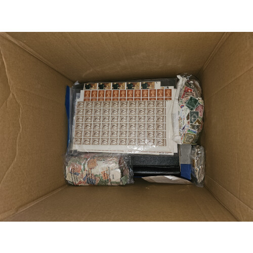 Accumulation in a BOX with worldwide ranges in stockbooks and albums, British Commonwealth in a well filled Tower springback album QV-QEII used mainstream (100s), Ireland used defins and commems in a high quality Willy Balasse (Brussels) peg album (similar to Oriel) with gold faced leaves, collections on leaves Saar, Saudi Arabia incl 1960s Oil Plant, Airs etc, Samoa, Senegal, Somalia, another peg album with mint GVI-QEII ranges and GB QEII on faced leaves plus extra pack of leaves etc, 100s. Heavy lot!