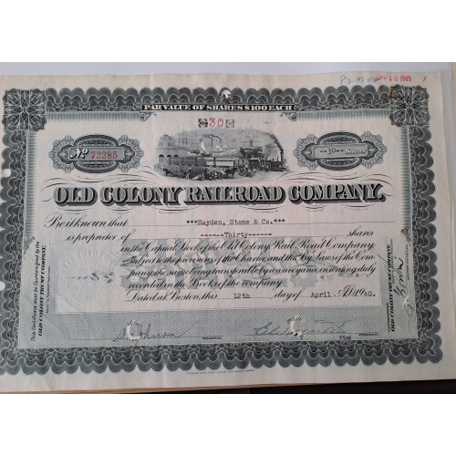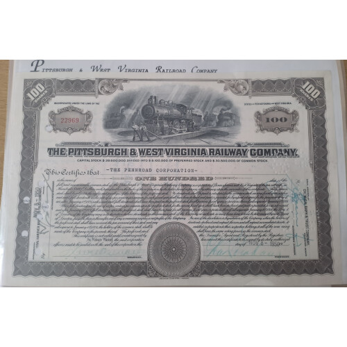 USA Railroad Share Certificates: Attractive small group including 1939 Baltimore Ohio Railroad 2 shares at $100 each with Interbond AG Guarantee certificate, 1969 Chicago, Rock Island & Pacific Railroad Co., 1957 Allegheny & Western Railway, 1958 Seatrain Lines, 1927 Trust Certificate, 1942 The New York & Harlem Rail Road Co., 1940 Old Colony Railroad Co., 1956 Delaware Lackawanna & Western Rail road Co., 1961 Western Maryland Railway Co., 1950 Pittsburgh & West Virgina Railroad Co., few faults mainly fine. (11).