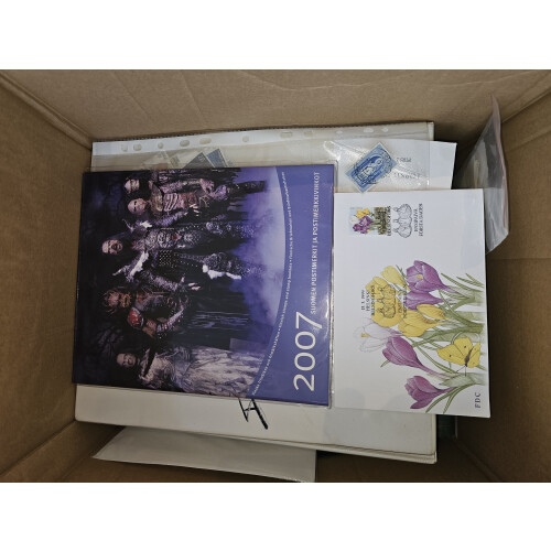 World accumulation in a BOX with many different countries and ranges in stockbooks and albums, or loose in envelopes, stockbook of Scandinavia in used blocks of 4 (well filled), various in binders, Finland 2007 year pack etc, 1000s.