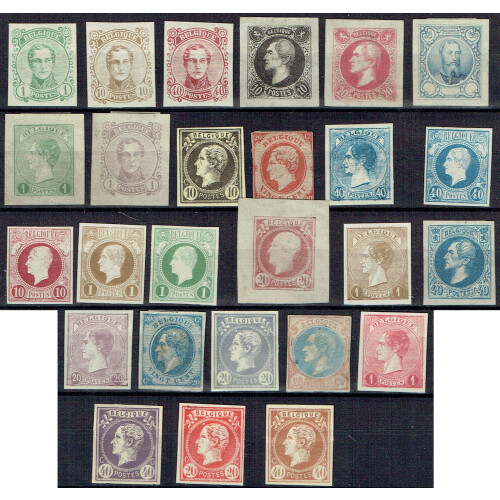 ESSAYS assembly of imperf defins for 1c, 10c, 20c or 40c values on white paper (all different), King Leopold (mainly) and King Albert from 1860s onwards, private impressions nice group (26). Interesting and unusual.