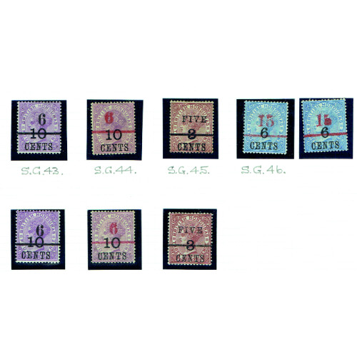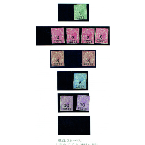 Balance of ex auction lot with mint and used arranged on leaves includes 1865 1d pale blue mint o.g. with short corner (Cat £70), 1s green used (trimmed perfs cat £140), 1872 1d blue unused, 6d rose f.u. (Cat £60), 1s green (2 shades used Cat £83), 1882 1d blue (4 used cat £35 each), 1d rose used (2), 4d mauve used (3), 1891 vals to 50c mint (Cat £235), 1891 surcharges mint (8), 188-91 surchs to 10c on 4d mint, 1888 bisect pair with normal on paper used, etc, jumbled and very mixed assembly with high cat value.