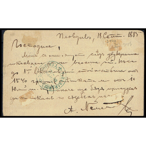 Eastern Rumelia: 1885 Commercial printed postal card in green and red for ROUMELIE ORIENTALE bearing 20pa carmine and pale rose with black Lion overprint tied local Phillippople bilingual CDS cancel and blue oval barred cancel with arrival T.PAJARU..NIK? backstamp. Fine. Scott 32.