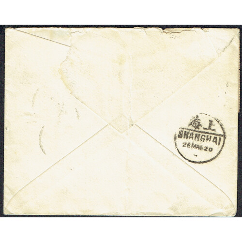 1920 Cover Kiukiang to UK nearing Junk defin 1c orange x 10 for 10c rate tied local cds cancels and part FROM STEAMER LETTER BOX (16) bi-lingual two line handstamp in violet, Shanghai backstamp, damaged flap and vertical fold. Fine strike.