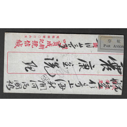 1929 Airmail 15c black and green (Type II) tied to printed cover in red on obverse sent from Hankow to Shanghai tied along with 4c Junk defin, boxed h/s in black on obverse, and unboxed h/s in red on reverse alongside Par Avion bilingual airmail etiquette. Evidence of two photo corners stuck to reverse and usual contemporary faults. Nice cover.