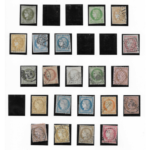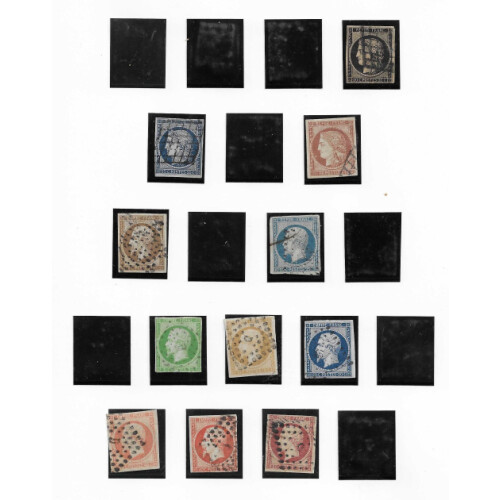 1849-1876 Attractive mainly fine used collection for different printings on three Safe album leaves noted 1850 10c bistre (3 margins Cat £400), 20c black, 25c blue, 40c orange (4 margins with tear cat £600), 1fr forgery, 1852 Repub 25c blue Napoleon, 1852-70 10c brown (nice 4 margins), 5c green, 10c bistre yellow, 20c blue, 40c orange (2 shades), 80c & 1fr (taken as reprint looks nice f.u.), 1862 perf 'set' to 80c, 1863-70 perf Napoleon good run 1c to 80c (15 values), 1869 5fr lilac-grey fine used appearance (heavy thinning cat £1300), 1870-71 Ceres imperf 1c (unused), 2c (Cat £325, thinned), 5c, 10c (2 shades), 20c blue (2), 80c rose (4 margins), 1871-76 perf issues 'set' to 80c, attractive lot with high cat values. (53).