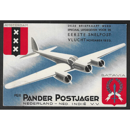 1933 (8 Dec to 26 Dec) Special Flight route attractive printed postcard for Amsterdam - Bandoeng - Amsterdam by Postlager (departure on Dec 9), bearing 30c triangle stamps issued for this flight, the 30c green is tied at Amsterdam, the 30c blue is cancelled at Pelikaan on 26th Dec (date of departure back to Amsterdam), the Postjager had engine failure at Italy so the flight mail was taken onwards by The Palikaan.