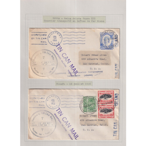 1935-41 Tin Can Mail - Four covers three are to USA other to Switzerland bearing Tonga defins and tied Niuafoou CDS cancels and a the multitude of cachets front and back in different colours. One to USA has postage due affixed on arrival. Few bends otherwise pretty group. (4).