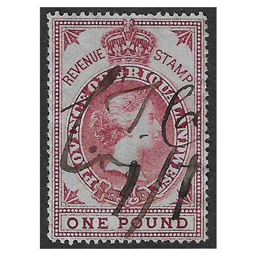 Griqualand: Revenues; 1879 £1 red portrait from Herbert Bourne tall revenue neatly cancelled pen ink manuscript. Mainly fine and seldom offered. Also 6d blue, Barefoot 62, 70. (2).