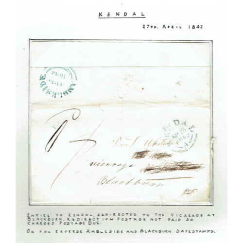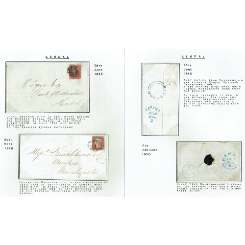 Kendal: 1826-1921 An exceptional collection of postal history neatly wirtten up for each item includes 1826/6 Penny Post with correct postmarks, 1838 London to Hoffrow missent in red, 1840 4th May dated arc, 1841 Barnards Castle, 1843 damaged Kendal MX, 1846 temporary blue KENDAL cancel used as a replacement for two months, 1842 redirected mail, 1855 STRAMONGATE sub post office single line in red, 1859 sideways duplex, 1864 strip of 4 1d pl.78, 1862 2d MORE TO PAY, 1897 & 1902 Parcel Post forms etc, fascinating lot with interesting and knowledgeable write up. (33 items).