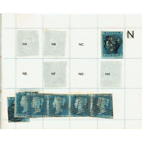 1841 2d blue small plate reconstruction booklet with 93 used examples mostly 1844 type cancels or London / Scottish numeral cancels in varying condition and varying margins, plenty of shades and postmarks plus a strip of 4 (poor, cut into badly), useful group circa 93 examples. Cat £8370.