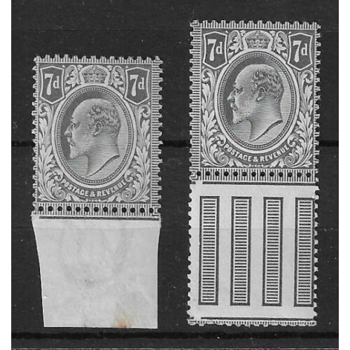 1902-10 7d grey-black and 7d deep grey-black both unmounted mint, grey-black is bottom marginal (hinged on margin) & deep grey-black is bottom gutter margin single, mainly fine and fresh, SG Spec. M37 (1), (2), Cat £194 for U/M single.