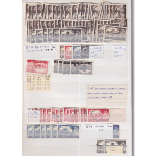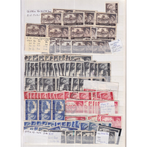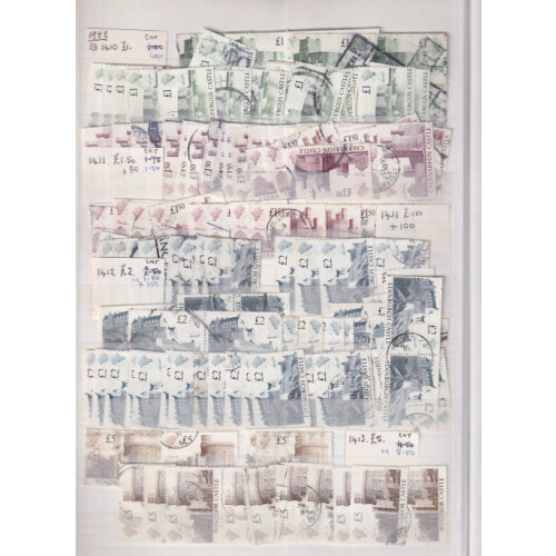 1952-1990s Stockbook with a heavily duplicated collection of used values includes Castles 1952 onwards with some better printings and CDS used copies to £1 incl SG 536/9 set f.u., SG 536a/9a set f.u., then duplicated DLR 2/6 to 10s, then BW onwards to £1 with many duplicated, then 1988-1990s Castles dozens of used CDS or parcel cancels to £5, etc some mixed condition but huge qty and cat value in excess of STC £8800 (in 2009). Only 3% cat.