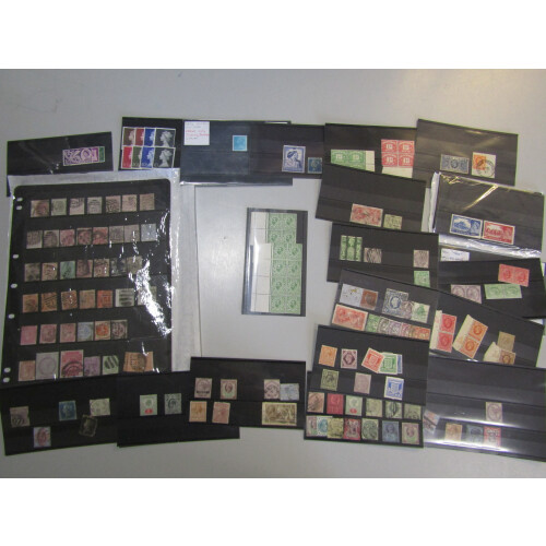 Smaller carton with a 'better' pre decimal accumulation with strength in QV to GV period chiefly used on stockcards, hagner, pocket book, packets, etc,..plus commercial covers. Includes 1840 1d black (poor) & 2d blue, QV surface printed & line engraved vals to 5/-, EDVII to 2/6d, GV many Seahorses with six 10/- values, GV defins ½d, 1d & 1½d all with central cross cut out of centre with 'CANCELLED' ovpt and a further 1d & 1½d ovpt 'CANCELLED', GVI with 1948 RSW set m., 1951 Festivals high vals to £1, 1964 Lifeboat Phosphor set umm, and much more inc. a few Revenues, Officials & cinderellas. Well worth viewing & would suit e bay trader (100s)