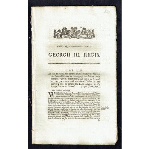Ireland: Two George II Acts of parliament for Irish Stamp Duties on Pamphlets, Almanacks, & Newspapers in Ireland 1815. Second document of 1806 to Repeal several duties on stamped Vellum, Parchment and paper in Ireland and to grant new duties in lieu thereof. Interesting documents. approx 23 printed pages.