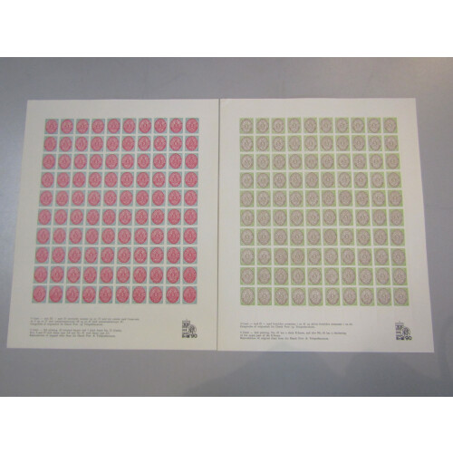 1977 KPK90 Bi-colour reproductions set of six in full sheets of 100 produced for the 90th Anniversary of Kobenhavn Philatelist and the 70th Anniversary of the transfer of DWI to the US Virgin Islands. Includes 1 cent in two different reprint sheets showing rare inverted frames, large and small pearl flaws, the Caroe cut and others with simulated embossed perforations. Comes with data sheet and reproduction of 1856 notice. Odd corner curl otherwise fine. (6 sheets, plus two items). In original club envelope.