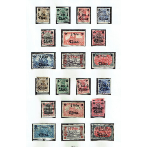 China: 1901-13 Collection on two album pages mint & used including 1901 Germany ovptd set 13 used at Tientsin or Shanghai (€600), 1905 surcharge set 10 mostly used with $½ & $2½ mint (€270), 1906-19 set of 10 mostly used, 40c & $1½ mint (€270). Neatly arranged on printed SAFE hingeless page. (34). Good cat value.