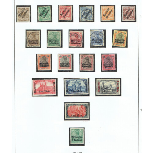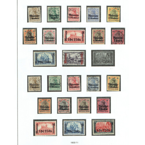 Morocco: 1899-1911 Collection on three album pages mint & used including 1899 Germany ovpt set of 6 m & u, 1900 Germany surcharge 35c on 30pf to 6p.25c on 5m mint top values (€470), 1905-11 set to 3p75c on 3m m & u, 1906 set with top 3 values mint (€310), 1911 surcharge set mint plus extras, etc. Neatly arranged on printed SAFE hingeless page. (24).