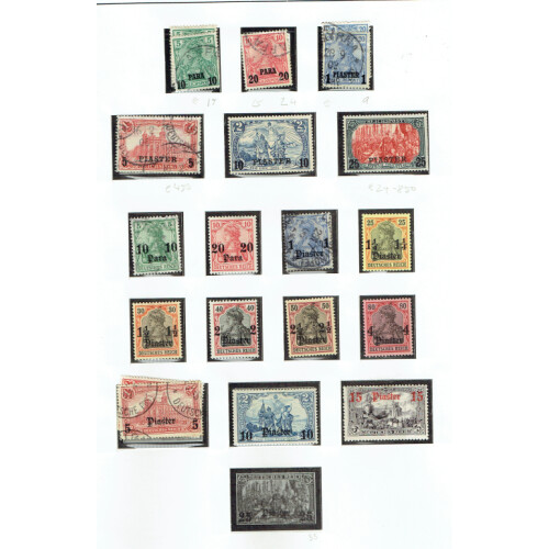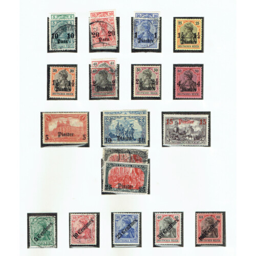 Turkey: 1884-1912 Collection on three album pages mint & used including 1884 Germany ovpt set of 5 (€430) m & u (2½PIA on 50pf is unused and signed Stolow on reverse, 1889 Germany surcharge set of six used, 1900-04 set to 25pi on 5m mint (€450), 1902-04 Overprint type II set of five used to 5pi on 1m, mint 10pi on 2m & 25pi on 5m (€625), 1905 set to 15pi on 3m mainly mint (€750), 1905-13 set to 25pi , 1908 Centimes set 5. Neatly arranged on printed SAFE hingeless page. (71). Huge cat value.