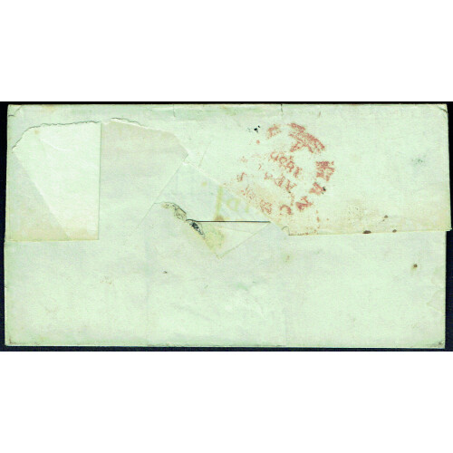 1836 (April) Entire Oldham to London bearing faint Oldham P.P. boxed in red with PAID AT MANCHESTER part circle in red and London 'tombstone' E PAID h/s alongside, damaged from opening and horiz. fold with some soiling.
