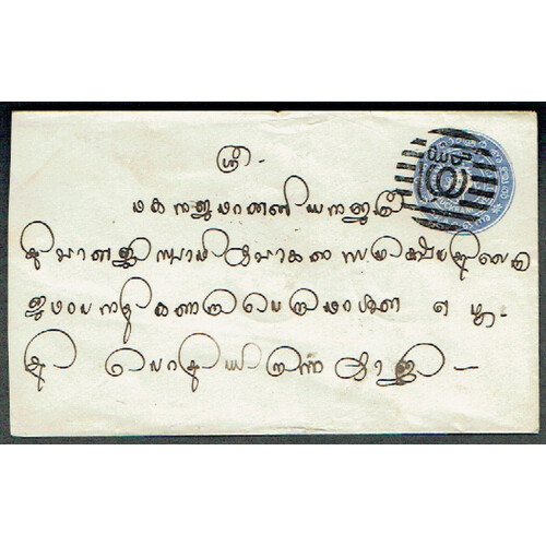 Three QV postal stationery envelopes used mainly to local addresses incl 1ch ultramarine (2) with native postmark in circle of bars, with two native backstamps, plus 2ch pink unused, nice trio. (3).