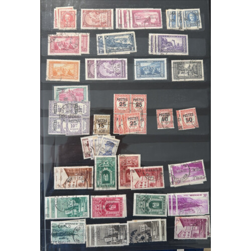 Stockbook with a mint and mainly used assembly duplicated including 1885 to 1f with 25c green (17 + pair cat £100 each), 75c f.u. (Cat £170), 1f (short corner cat £700), 1891 25c green (20+ cat £50 each), 1933 air used, 1933 vals to 20f used (Cat £500+), 1950 Accession 50c printed card for Prince Rainier, etc. High cat.