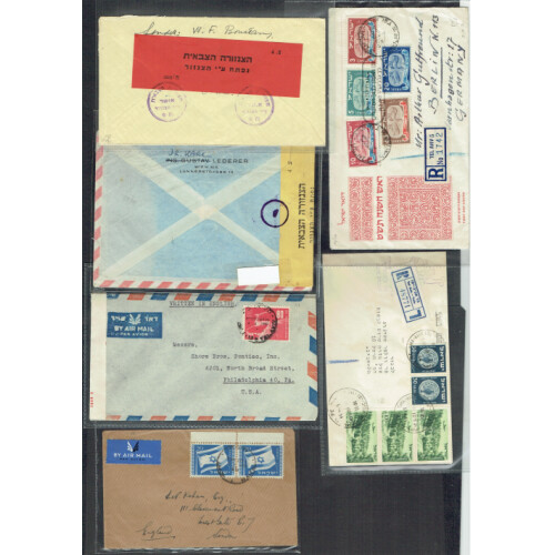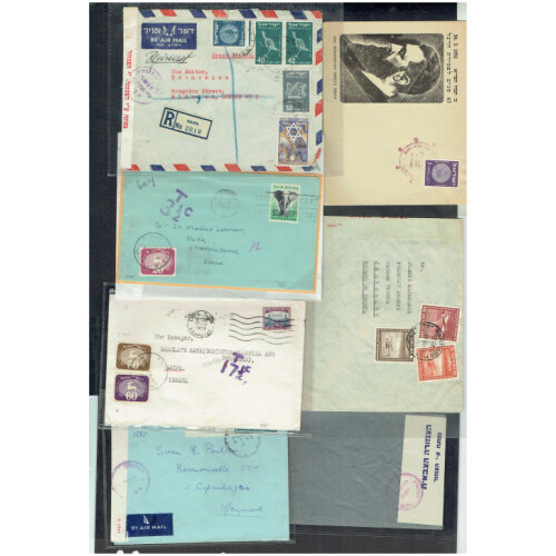 Israel: Large group of commercial covers from 1948 onwards including 1948 (16 May) Coins low value singles to 50m on illus FDC to UK, 1956 PPC 24th Zionist Congress, WWII censor Haifa to UK, 1953-55 incoming postage dues, 1948 provisionals on regd cvr from Jerusalem, 1951 Herzl death illus cvr, 1949 incoming censor from Chile, 1949 outgoing censor to Denmark, 1948 Australia to Jerusalem with Israel censor, 1949 red censor label on reverse, 1950 Austria to Army post office No.475 Israel Army, 1948 Flying Scroll set 5 on FDC (no tab), 1954 Censor Tel Aviv to UK, 1952 Menora with half tav illus FDC, airs on 1954 censor cvr to USA, intr group.