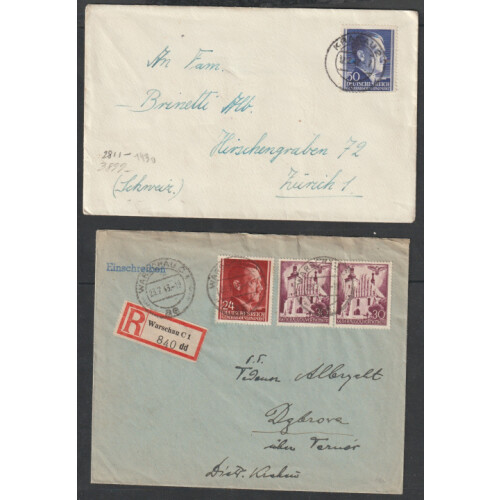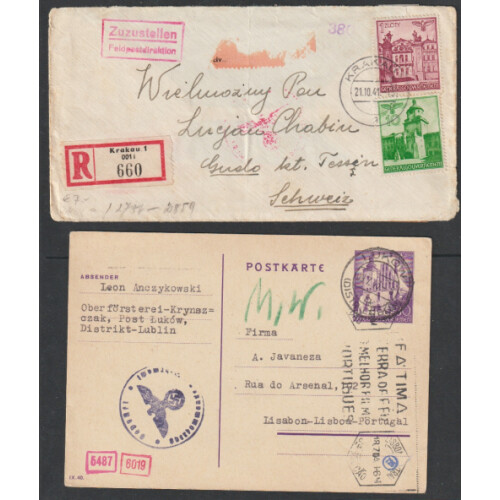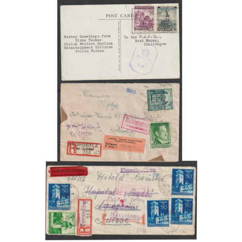 POLAND - GENERAL GOVERNMENT WWII MAIL under German Occupation. Group of ten censored covers some multi Franked with various General Government Hitler or pictorial issues incl used in Drohobycz (now in Ukraine), Easter Greetings PPC from Diana Tauber Polish Welfare Section, Entertainment Division Polish Forces, Zyrardow regd letter to Switzerland, Warsaw C1 regd, 1943 Lukow to Lisbon 30pf P/S card, 1944 uprated 12pf P/S card to Switzerland, one poor condition (not counted), interesting group.